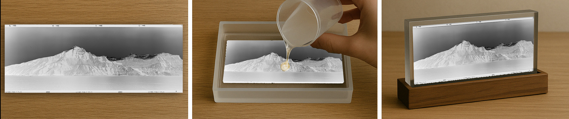 The corresponding negative, after being developed in the darkroom and safely transported to its destination, is cast in resin – as both an object and a manifestation of uniqueness. In this way, my photography becomes not merely a fleeting capture of a moment, but a sculpture of the instant.